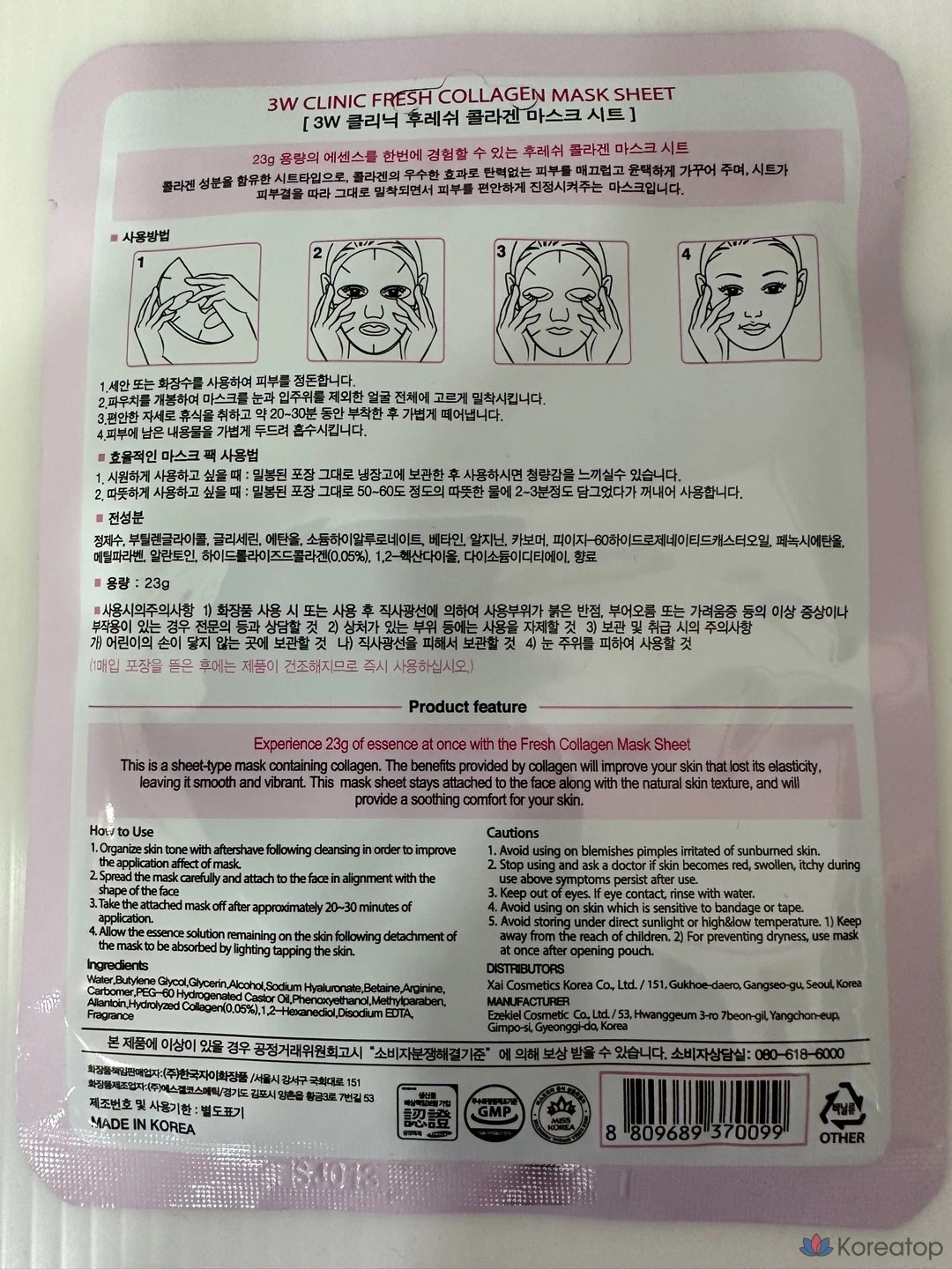 3W Clinic Свежая коллагеновая маска-салфетка, 1 лист, 1 упаковка