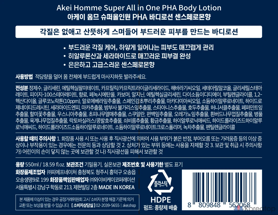 Akei Derma+ Homme Super All-in-One PHA Perfume Body Lotion Sensepheromone Scent, 550 мл, 1 шт.