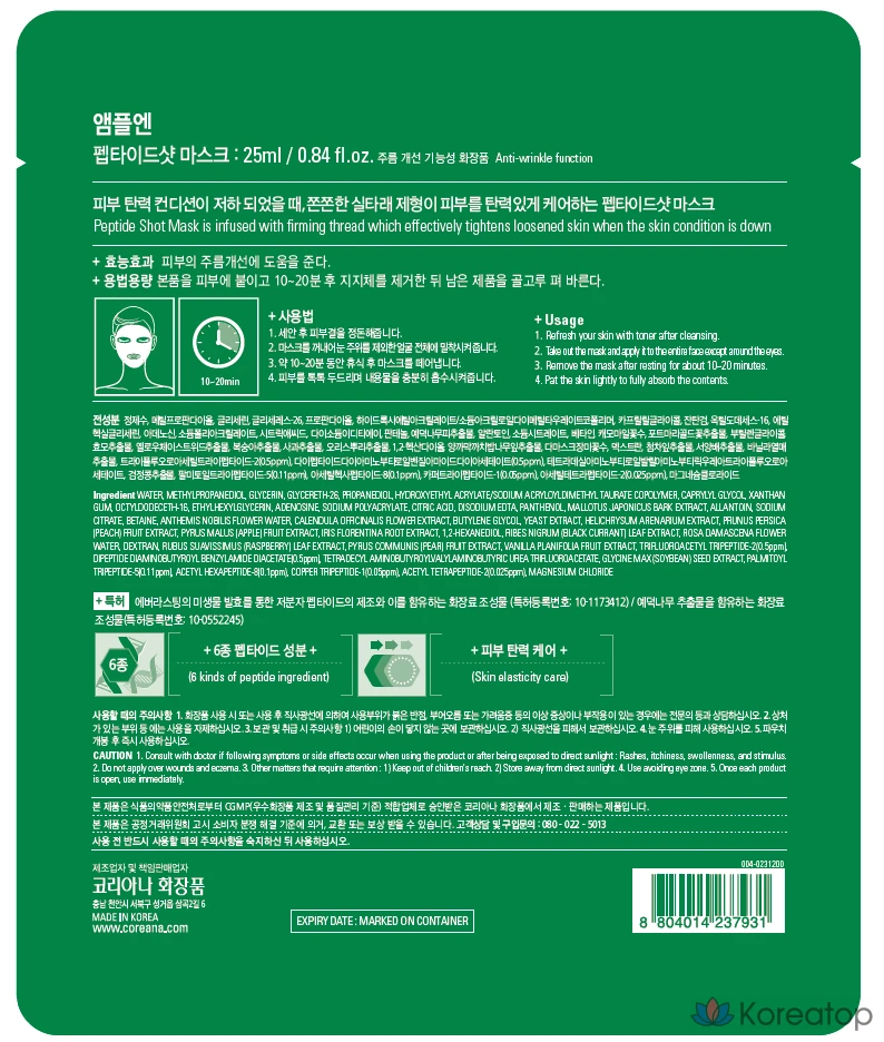 Пептидная маска-шот (эластичная), 7 листов, 1 упаковка, 7 штук