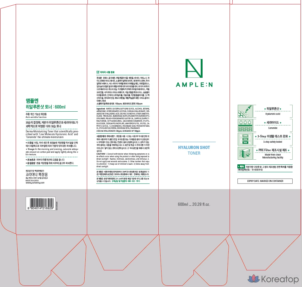 Набор Koreana: AMPLE:N ампула-тоник с гиалуроновой кислотой, 600 мл + очищающий тоник-шот, 600 мл + дозатор для тоника, 1 комплект.