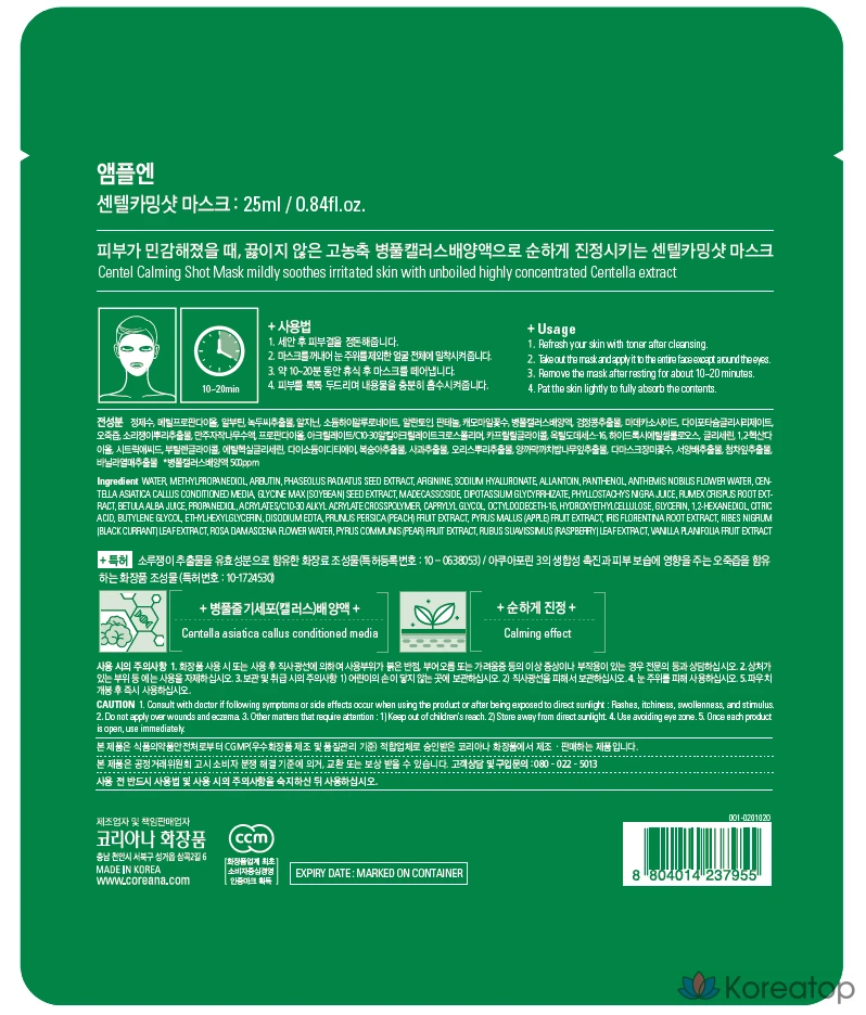 Успокаивающая маска для лица Koreana AMPLE:N & Centella Calming Shot, 5 листов, 1 упаковка, 5 штук.