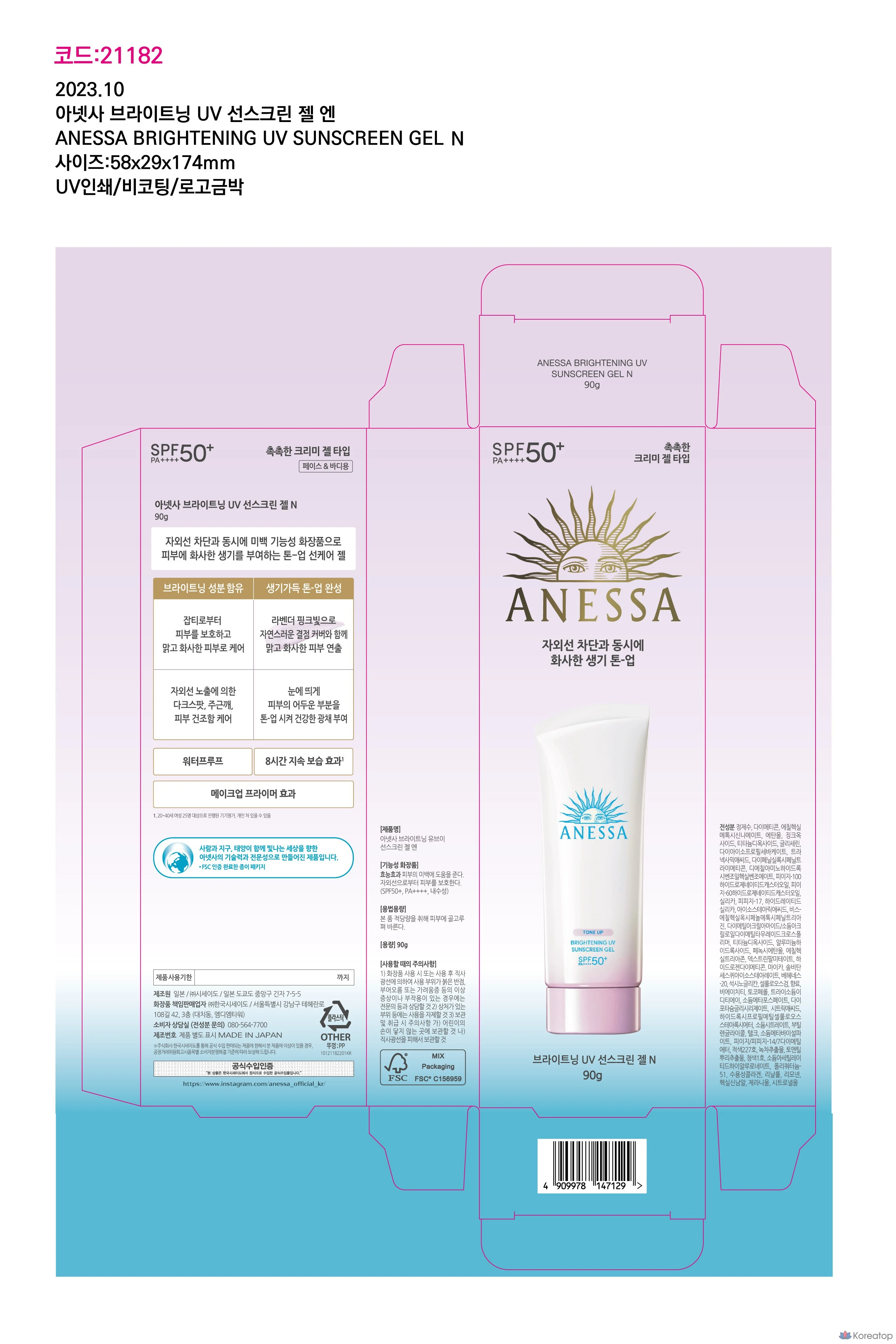 Солнцезащитный гель Anessa Brightening UV Sunscreen Gel N SPF50+ PA++++, 90 г, 1 шт.