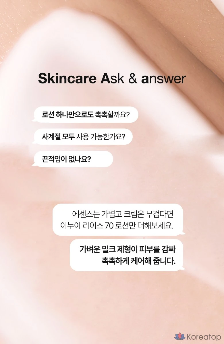 Лосьон Anua Rice 70 обеспечивает интенсивное увлажнение благодаря экстракту риса, который питает и смягчает кожу. Его легкая молочная текстура быстро впитывается, оставляя ощущение свежести и комфорта. Подходит для всех типов кожи, особенно для сухой и чувствительной. Используйте ежедневно для достижения наилучших результатов и наслаждайтесь мягкой и увлажненной кожей каждый день. 🌾