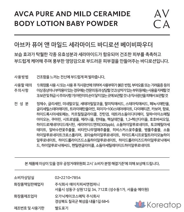 Детская присыпка для тела AVCA Pure & Mild Ceramide, 1 шт., 800 мл