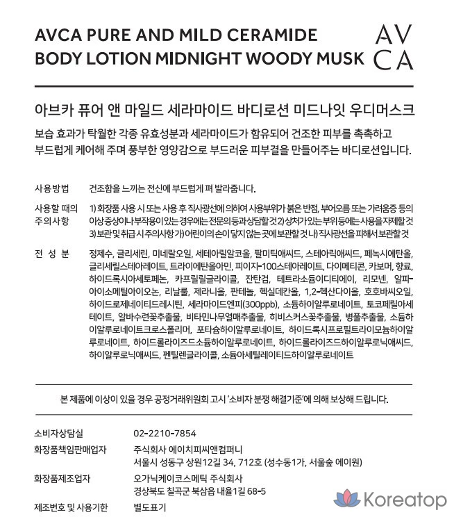 Лосьон для тела AVCA Pure & Mild Ceramide Midnight Woody Musk, 1 шт., 800 мл