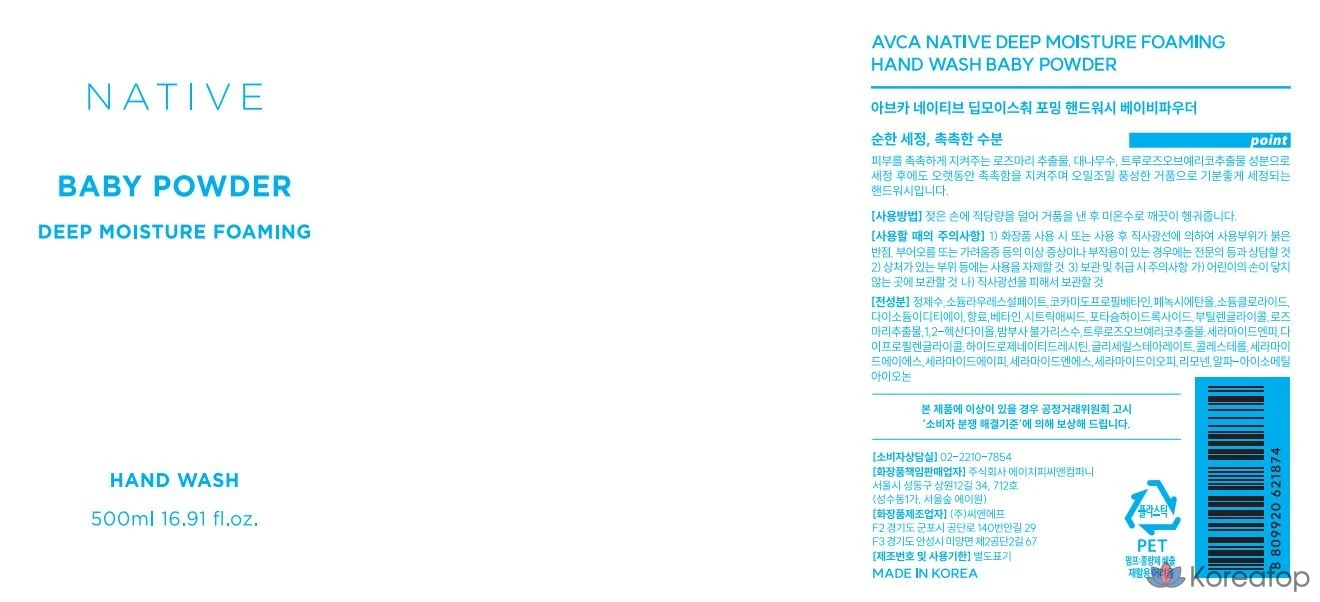 Пенящееся жидкое мыло для рук AVCA Native Deep Moisture с ароматом детской присыпки, 500 мл, 1 шт.