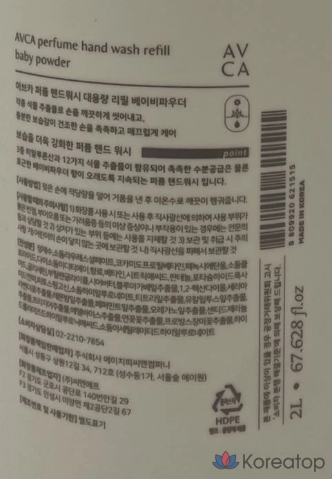 Сменный блок для жидкого мыла AVCA Perfume Hand Wash, аромат детской присыпки, 2 л, 1 шт.