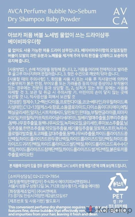 Сухой шампунь AVCA Perfume Bubble No-Sebum без кожного сала, аромат детской присыпки, 1 шт., 200 мл