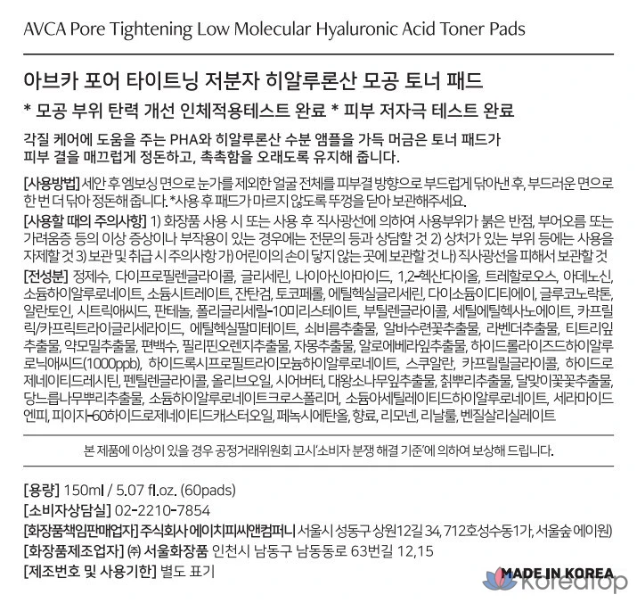 Тонизирующие подушечки для сужения пор AVCA с низкомолекулярной гиалуроновой кислотой, 150 мл, 1 упаковка, 60 листов