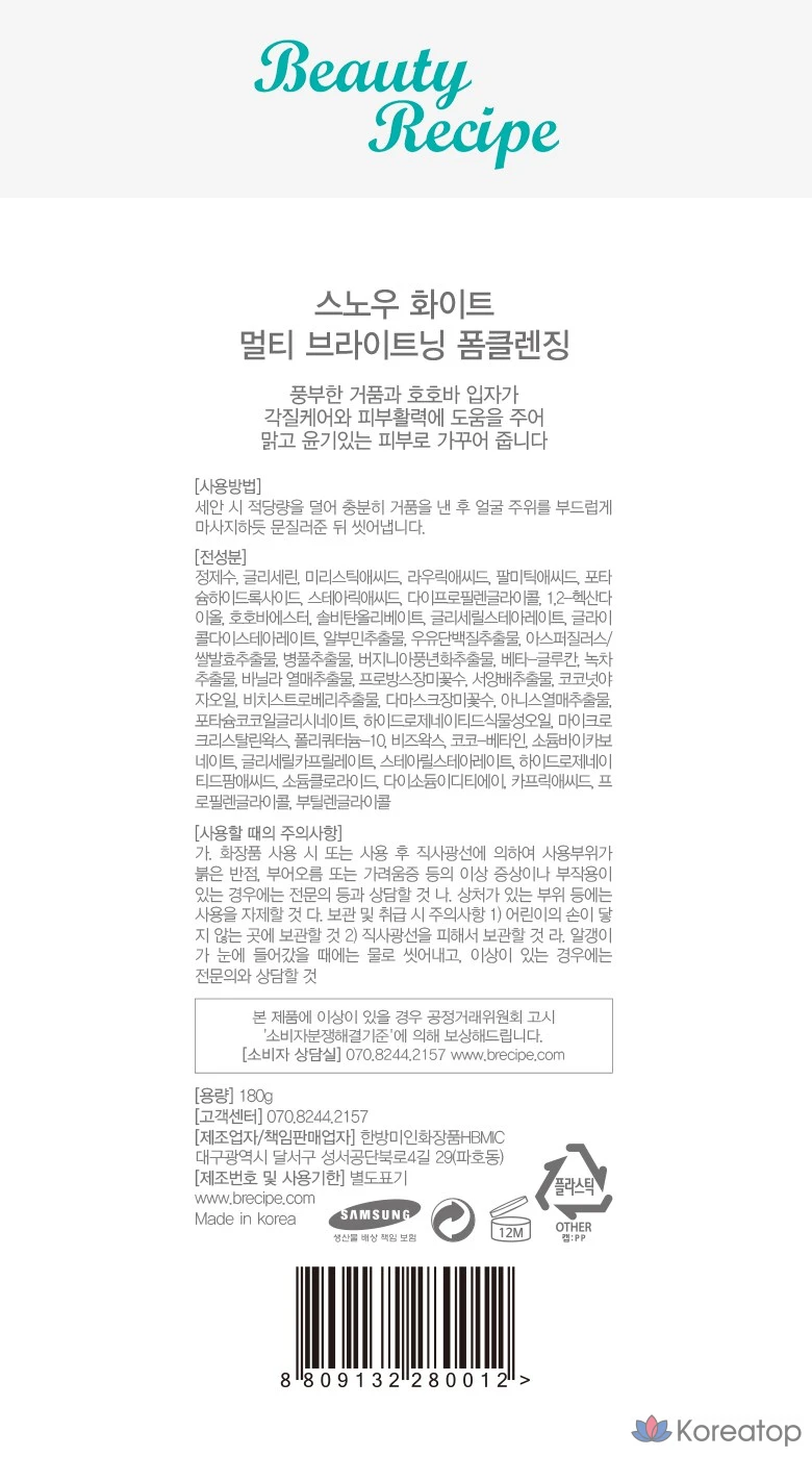 Очищающая пенка для лица Beauty Recipe Snow White Multi-Brightening Foam Cleansing, 180 г, 1 упаковка