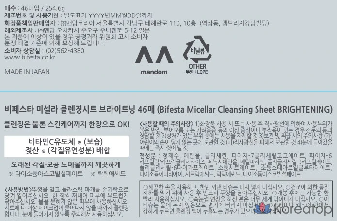 Мицеллярные очищающие салфетки Bifesta Brightening предназначены для бережного снятия макияжа и осветления кожи. Пропитанные эмульсией с витамином C и молочной кислотой, они эффективно удаляют даже водостойкий макияж, глубоко очищают поры и способствуют обновлению клеток. Глицерин в составе увлажняет и смягчает кожу, придавая ей сияющий и здоровый вид. Удобная упаковка с герметичной крышкой позволяет брать салфетки с собой в дорогу. 🚀