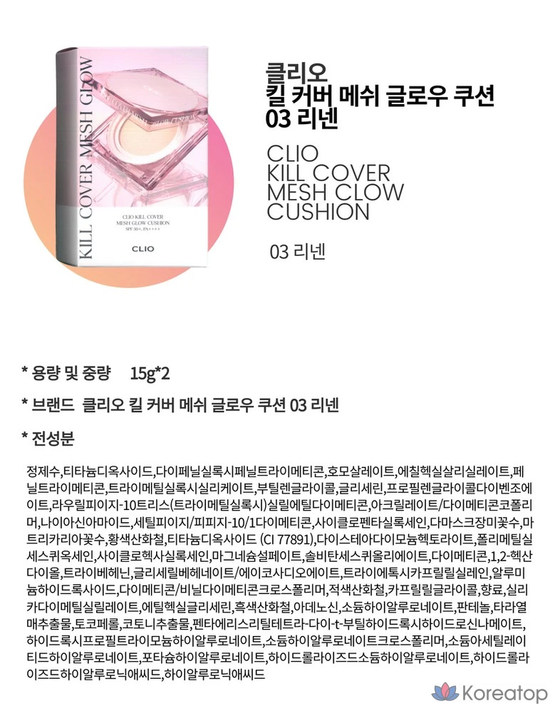 Clio KillCover Mesh Glow Cushion 15 г Основной продукт + Сменный блок, тонкий чехол Kill Cover, высокоадгезионный, кремообразный, эластичная формула, 03 Лен, 1 шт.