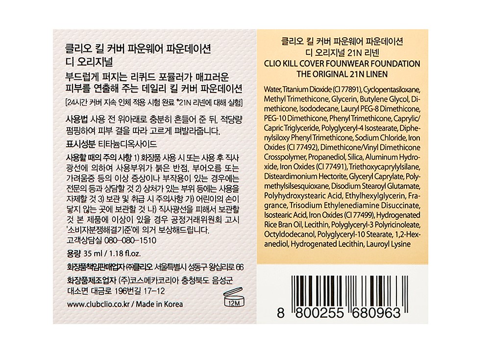 Тональный крем Clio Kill Cover Foundation The Original, 35 мл, 1 шт., оттенок 21N Linen