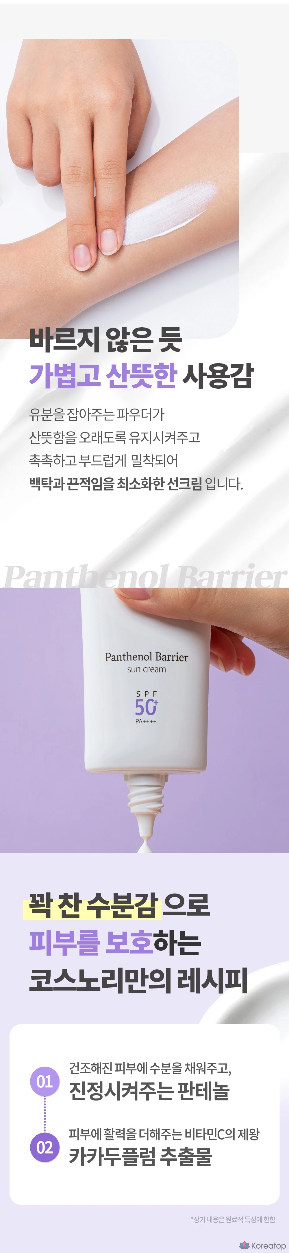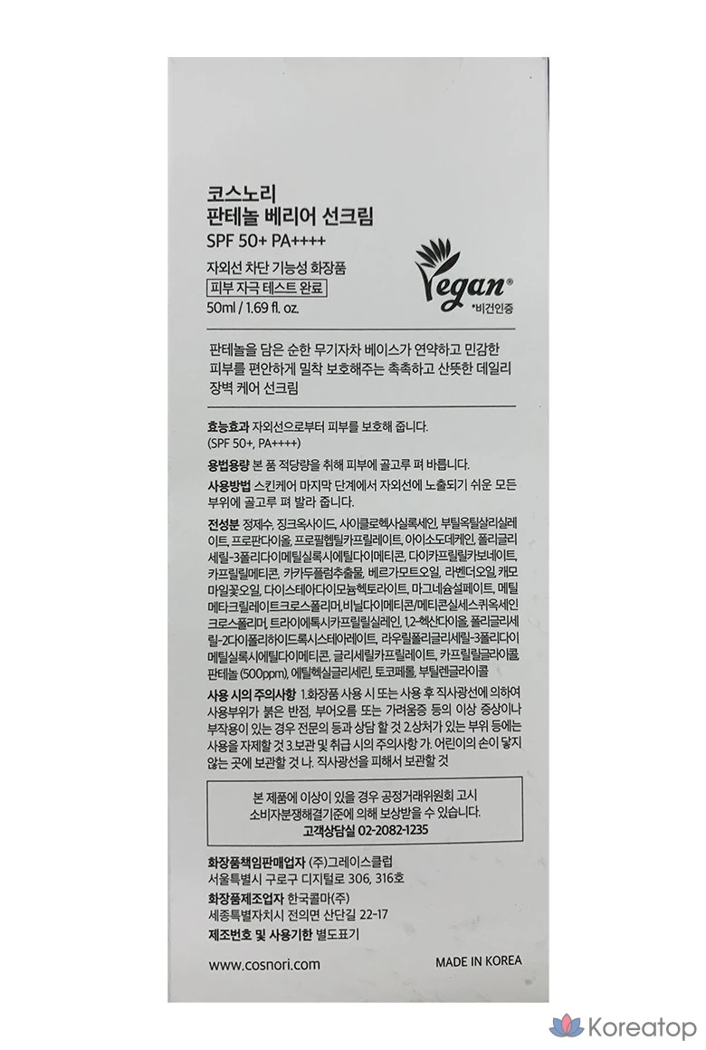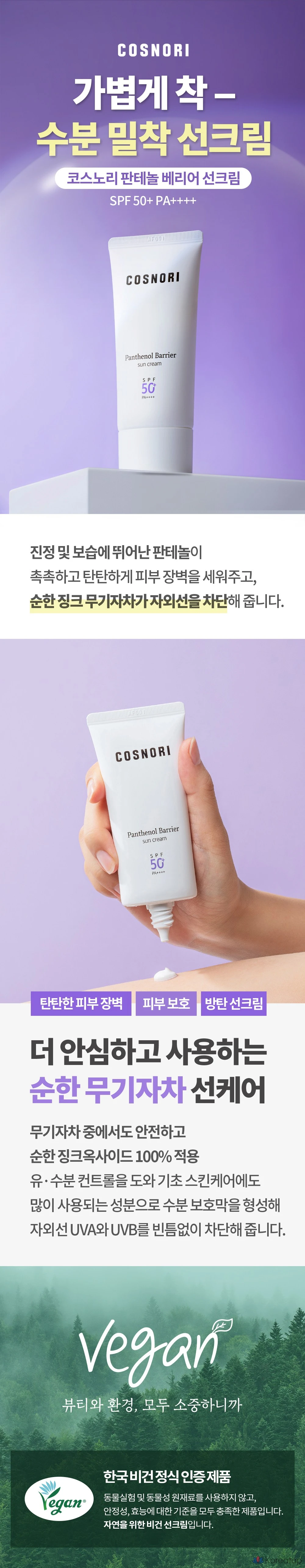 Этот увлажняющий солнцезащитный крем от Cosnori обеспечивает надежную защиту от UVA и UVB лучей благодаря SPF50+ и PA++++. Его минеральная формула с пантенолом увлажняет кожу, не оставляя жирного блеска. Крем подходит для всех типов кожи, включая чувствительную, и помогает поддерживать естественный баланс влаги. Легкая текстура быстро впитывается, обеспечивая комфортное нанесение и длительную защиту. ☀️