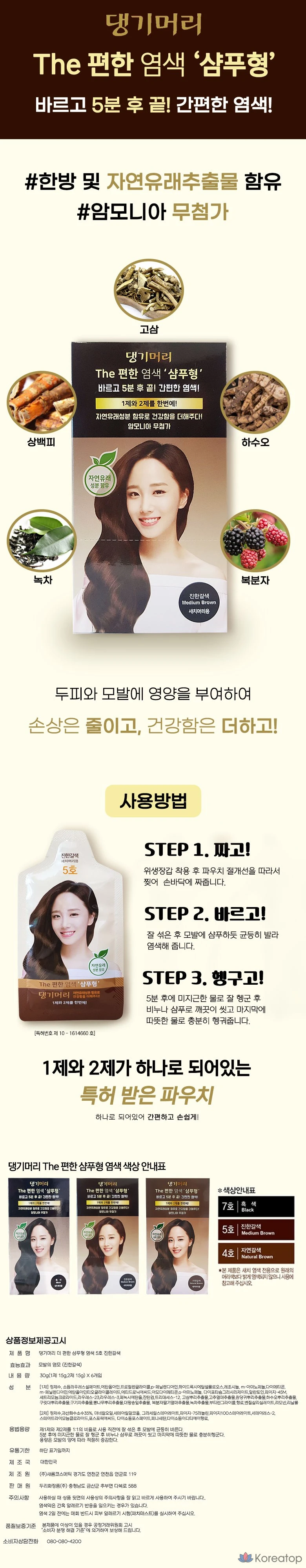 1 флакон шампуня-краски для волос Danggi Meori More Comfortable, 30 г, № 5, темно-коричневый.