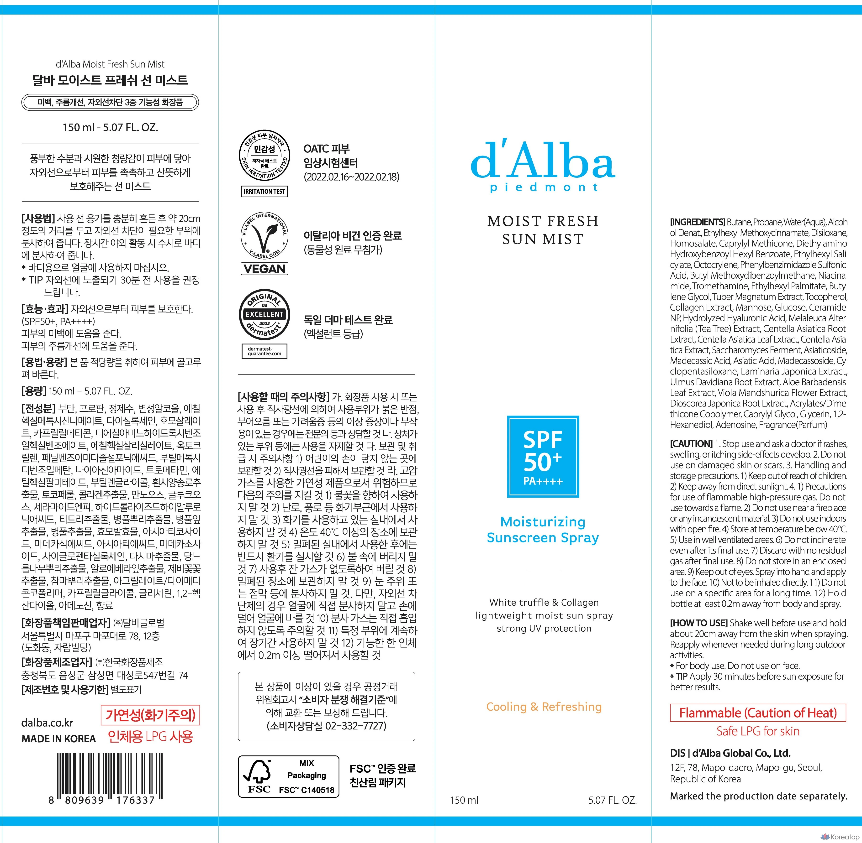 Увлажняющий солнцезащитный спрей D'alba Moist Fresh Sun Mist SPF50+ PA++++, 1 шт.