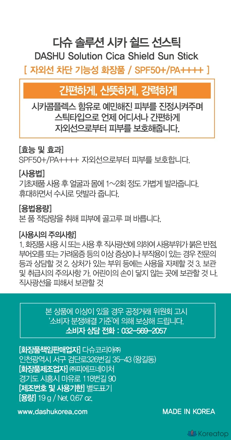 Солнцезащитный стик Dashu Solution Cica Shield SPF50+ PA++++