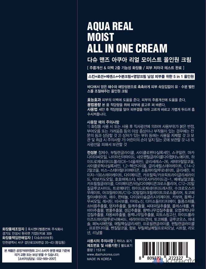Увлажняющий крем DASHU Men's Aqua Real Moist All-in-One Cream, 153 мл, 1 шт.