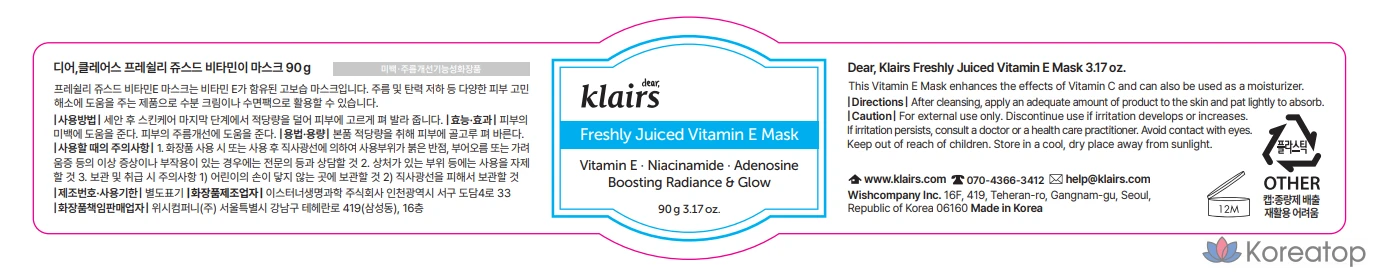 Маска Dear, Klairs со свежевыжатым соком и витамином Е, 1 шт.