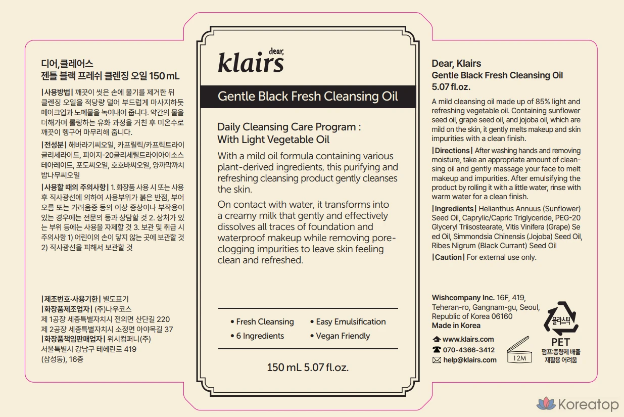 Очищающее масло Dear, Klairs Gentle Black Fresh, 30 мл, 1 шт.
