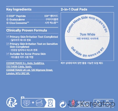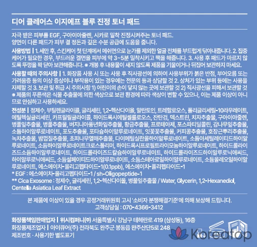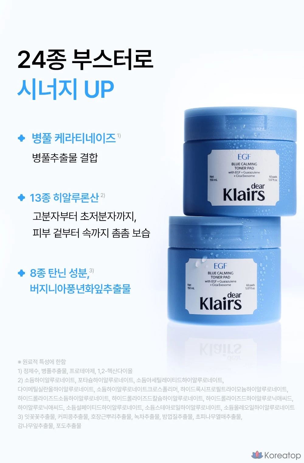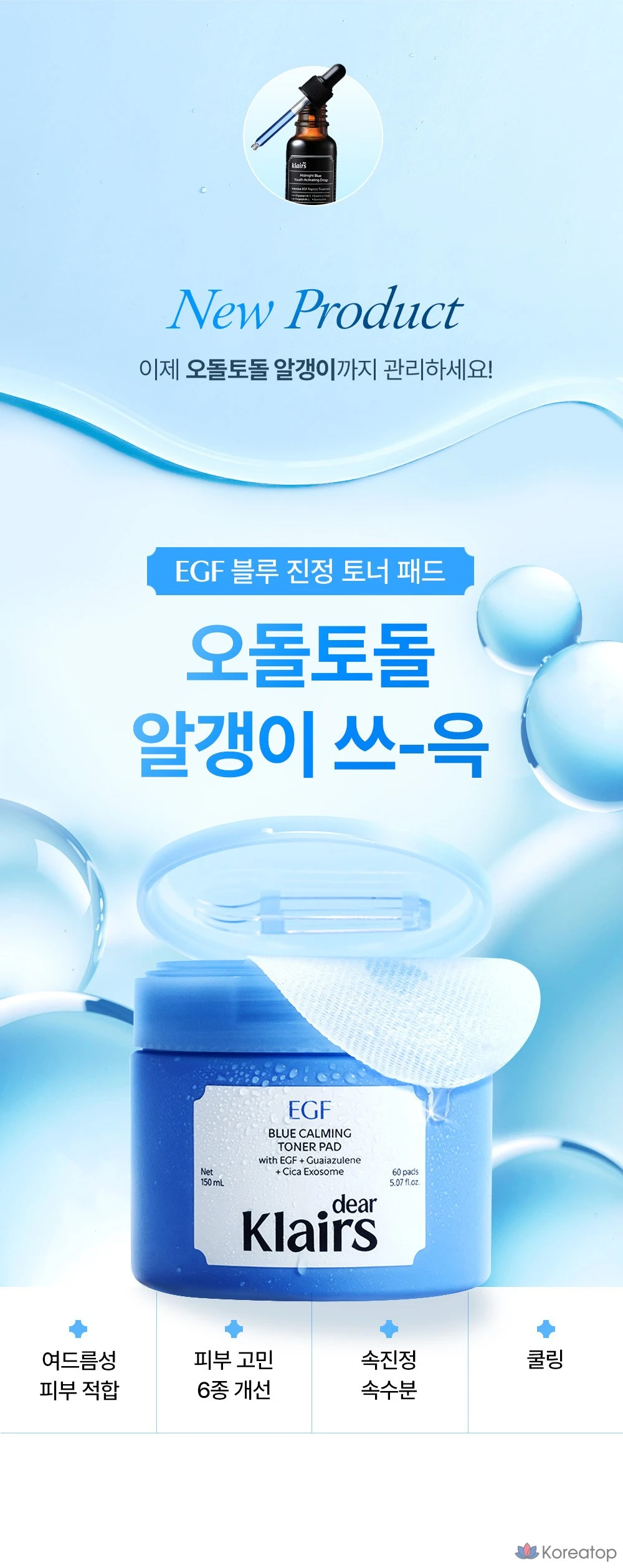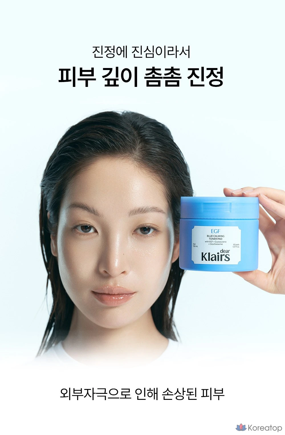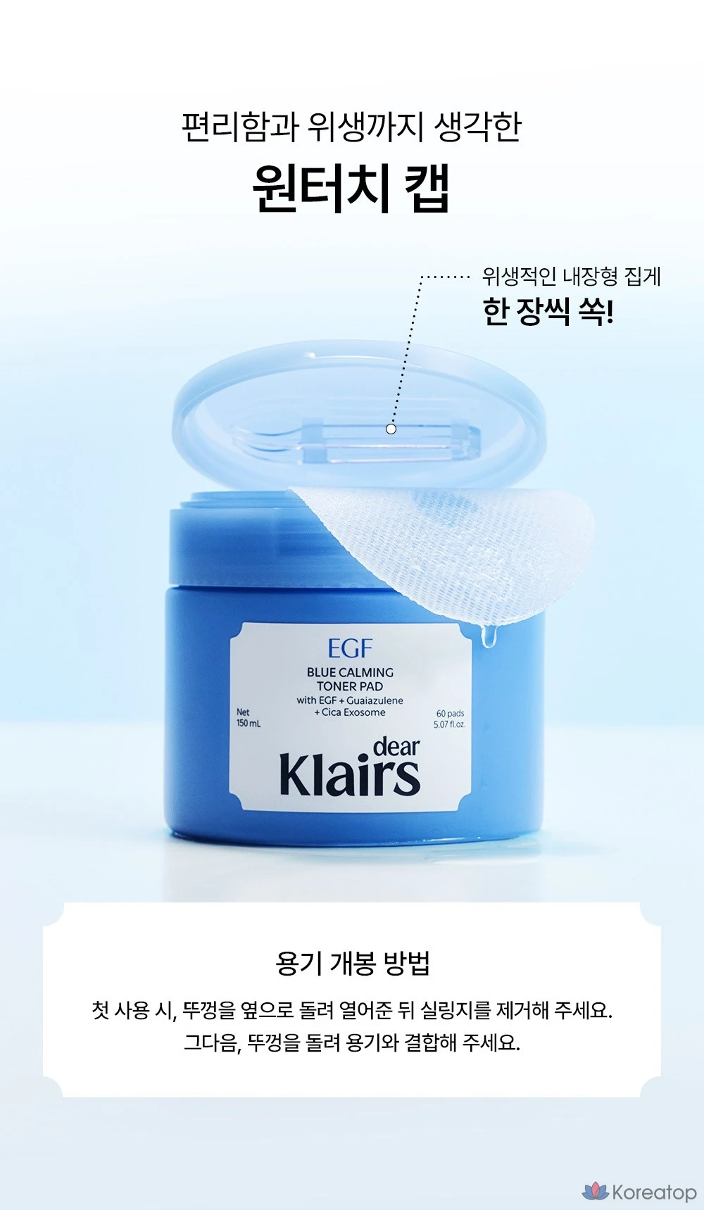 Тонизирующие подушечки Dear, Klairs EGF Blue Soothing Toner Pads, 150 мл, 60 листов, 1 упаковка.