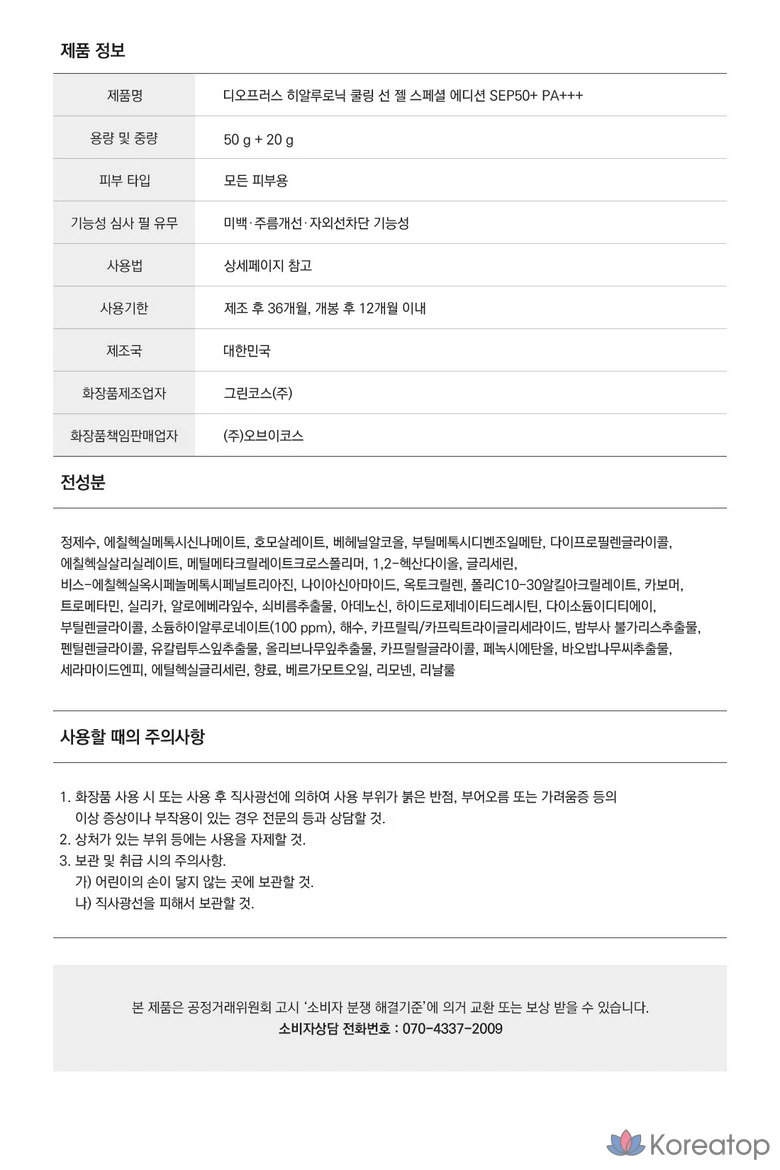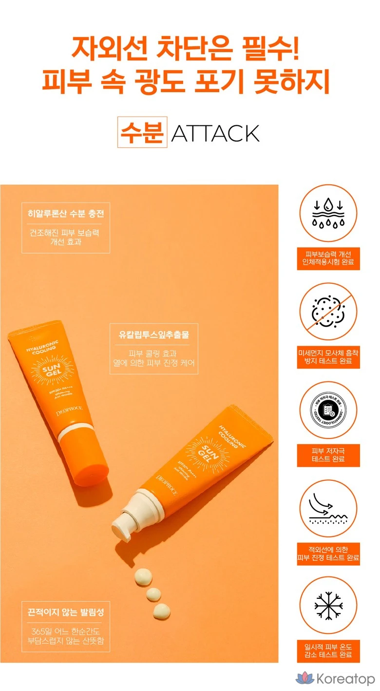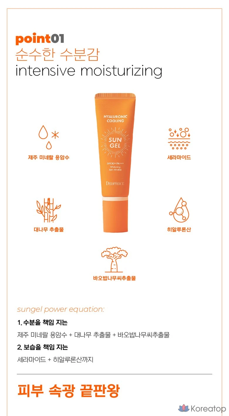 Охлаждающий солнцезащитный гель Deoproce с гиалуроновой кислотой, SPF50+ PA+++, 70 г, 1 комплект.
