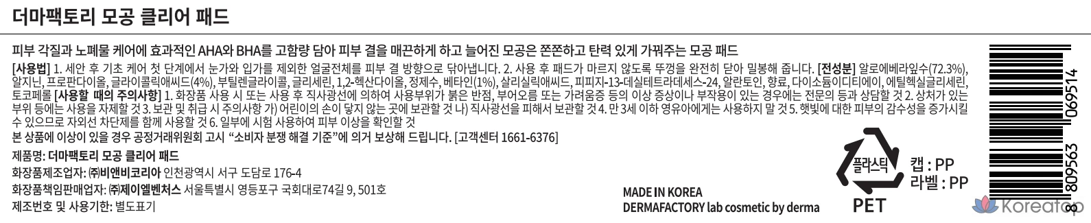 Очищающие подушечки для пор Derma Factory Vegan Pore Clear Pads, 140 мл, 40 листов, 1 упаковка