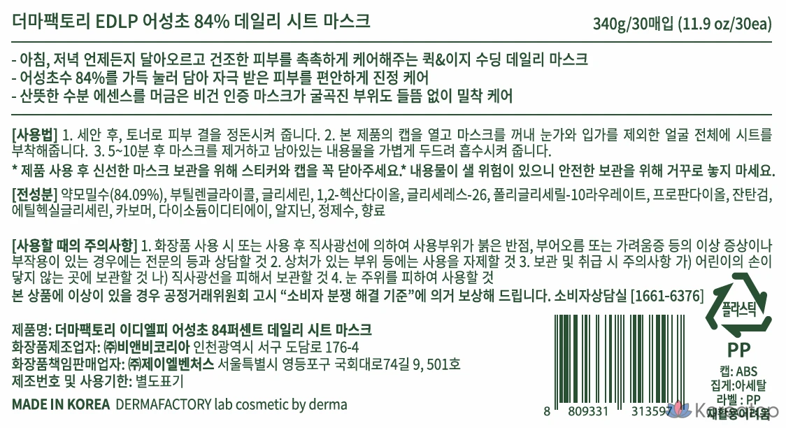 Тканевая маска для лица Derma Factory EDLP 84% Asungcho Daily Sheet Mask, 1 шт.