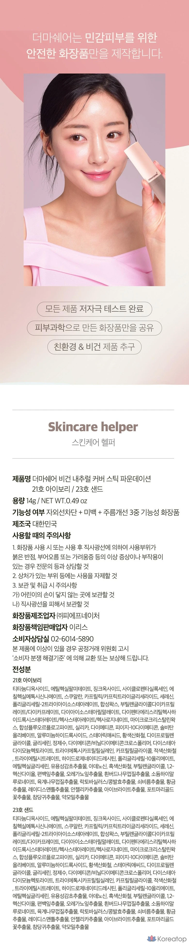 Тональный крем-стик Dermashare Vegan Natural Close-Fit Cover Stick Serum Foundation SPF50+ PA+++ 14 г, 1 шт., № 21, цвет слоновой кости