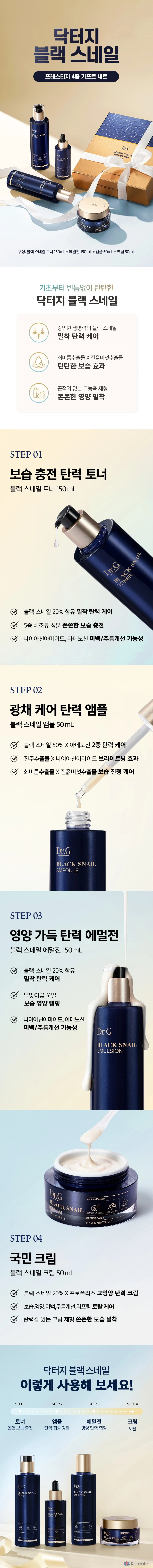 Dr. G Black Snail Prestige — это комплексный уход за кожей, включающий тонер, эмульсию, ампулу и крем. Каждый продукт разработан для глубокого увлажнения и восстановления кожи, благодаря экстракту черной улитки. Набор из 4-х пакетов для покупок делает его удобным для использования в путешествиях или в качестве подарка. Этот набор идеально подходит для тех, кто ищет эффективное решение для поддержания молодости и сияния кожи. 🐌✨