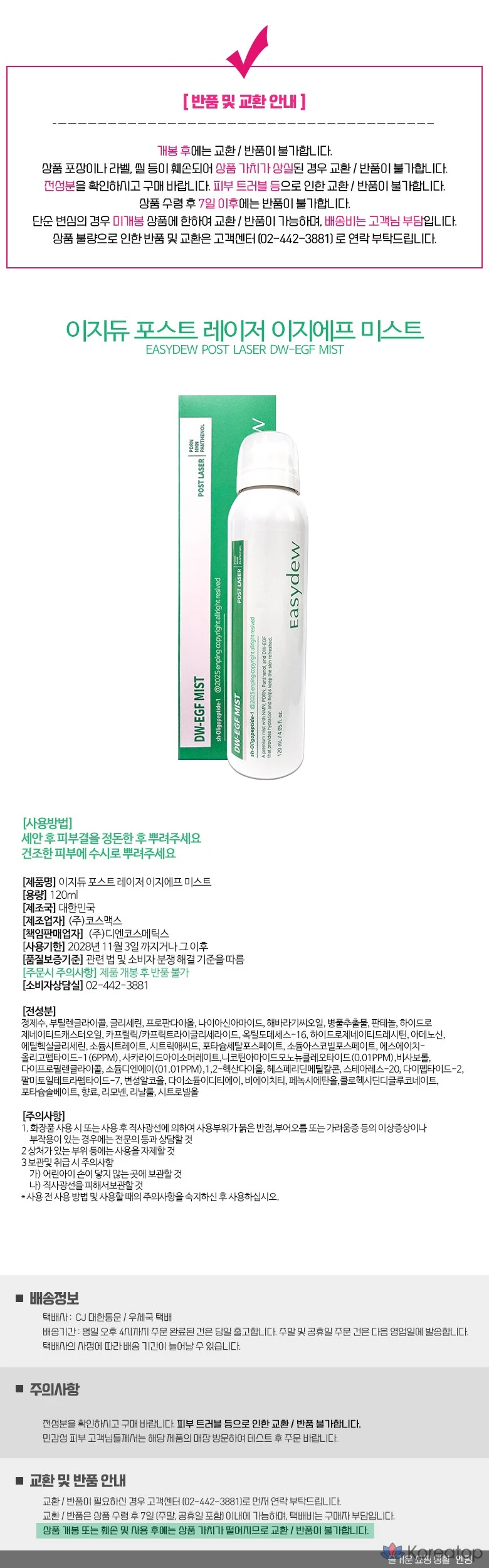 Daewoong Pharmaceutical Easydew Post-Laser Root Serum DW-EGF Easy EGF Mist, 1 шт., 120 мл