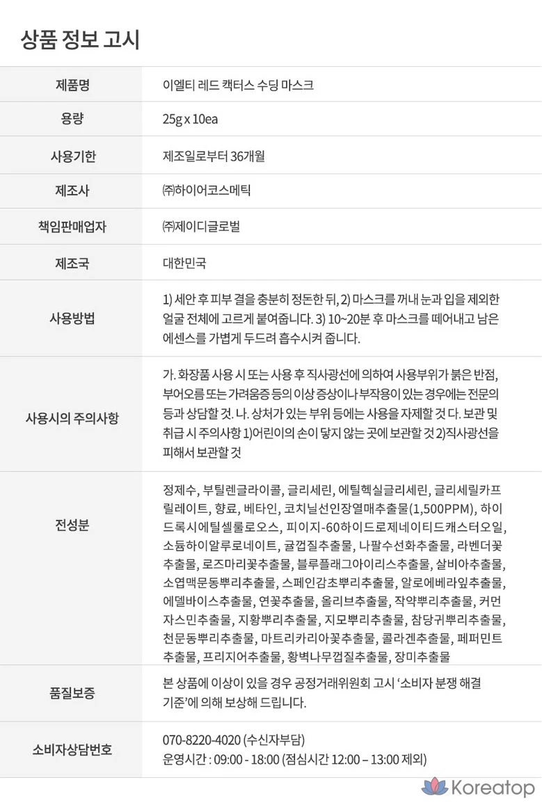 Успокаивающая маска ELT Red Cactus с гиалуроновой кислотой, 10 листов, 1 упаковка, 10 штук.