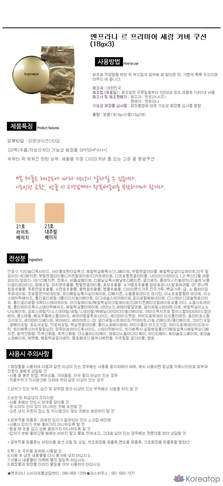 Enprani Le Premier Serum Cover Cushion, 18 г x 3, № 21, светло-бежевый