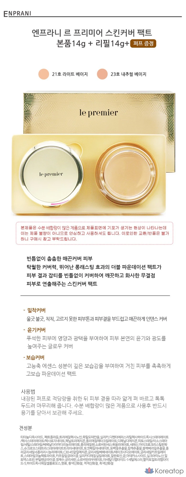 Тональный крем Enprani Le Premier Skin Cover Pact (основной продукт + сменный блок), 1 шт., № 23, натуральный бежевый.