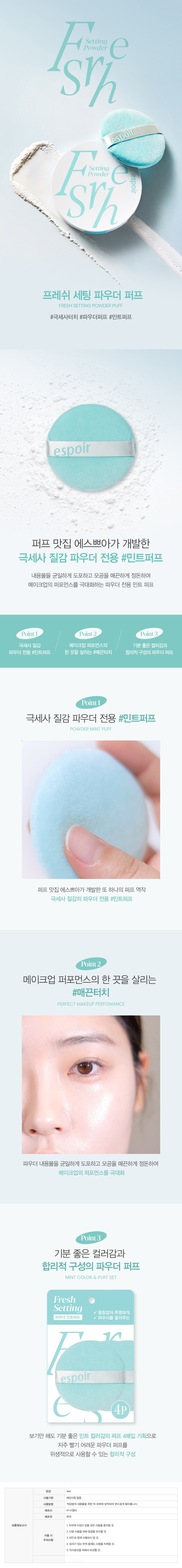 Набор из 4 пуховок для фиксации макияжа Espoir Fresh Setting Powder Puff, мятный цвет, 1 комплект.