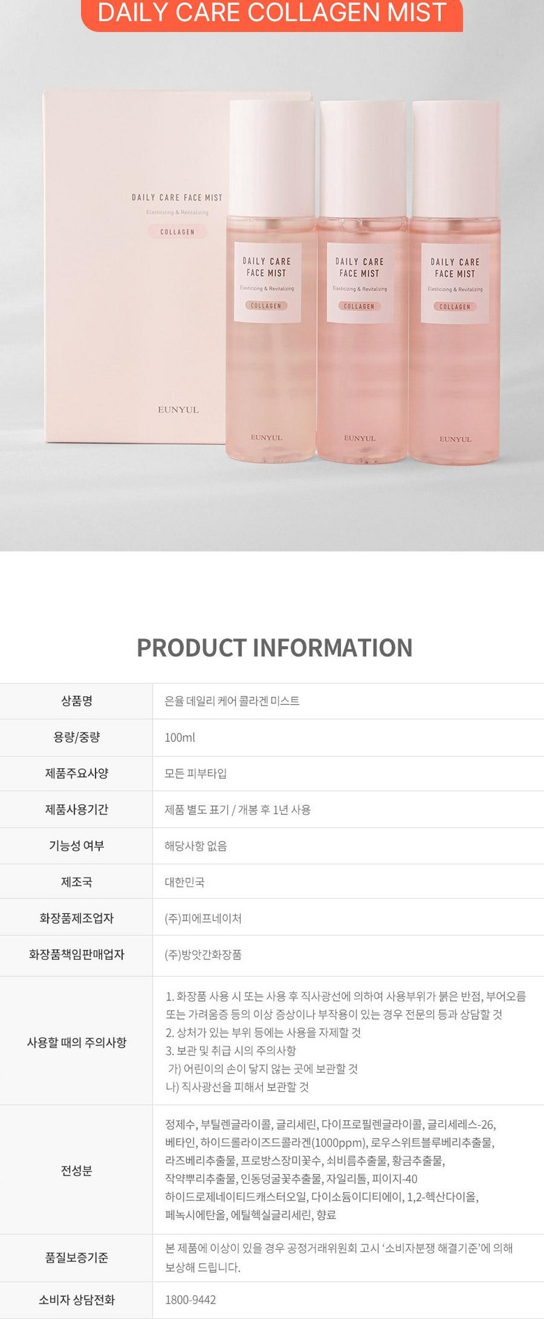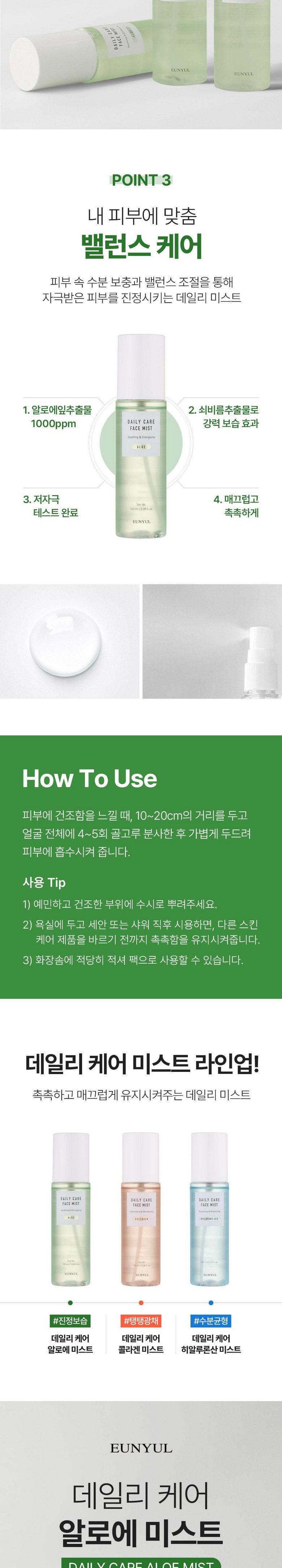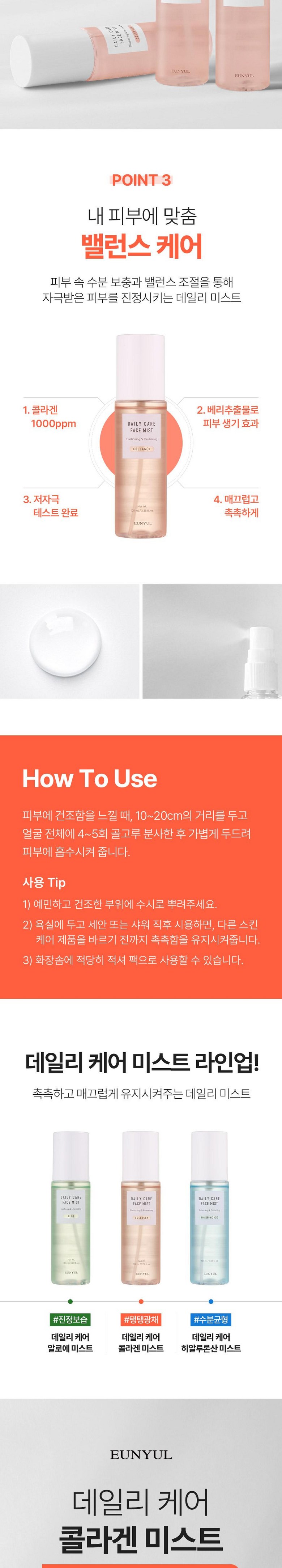Набор из 3 спреев для лица Eunyul Daily Care Mist, Eunyul Collagen, Aloe, Hyaluronic Acid, 100 мл, 1 комплект.