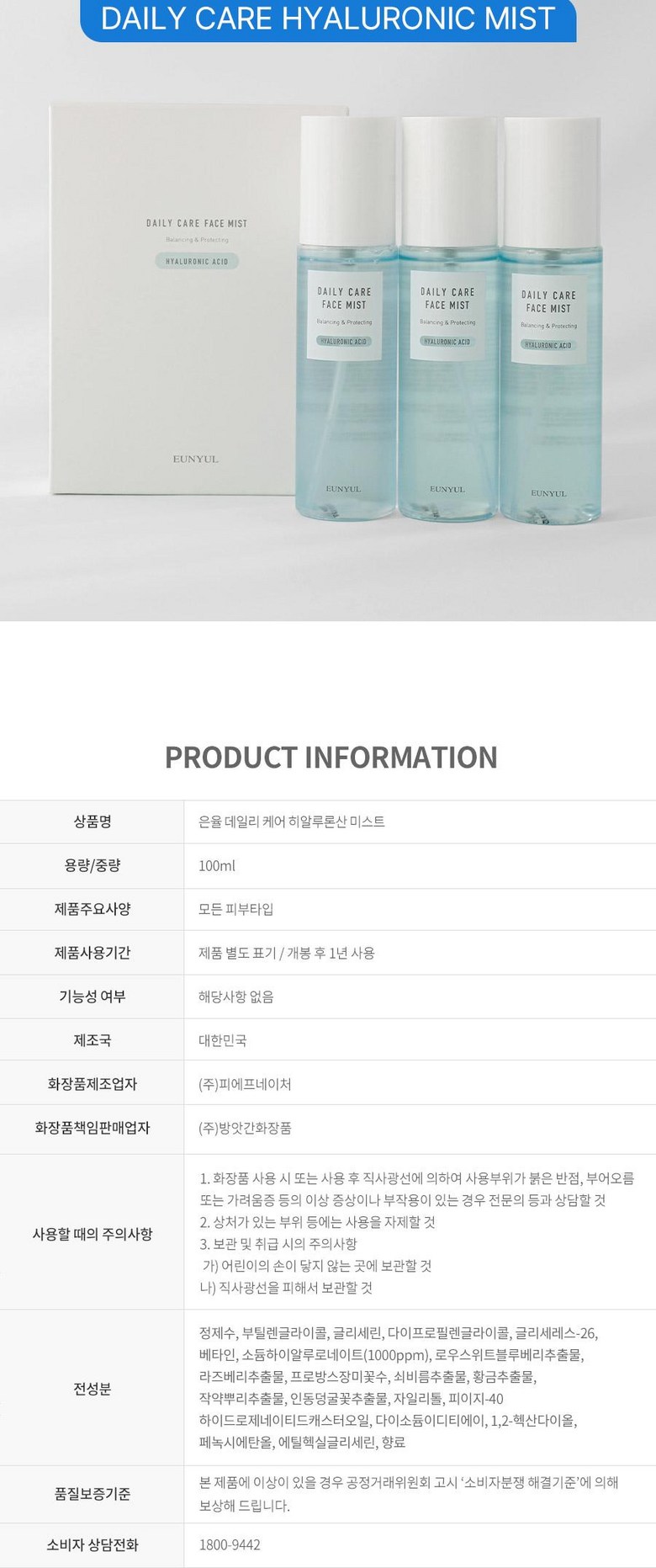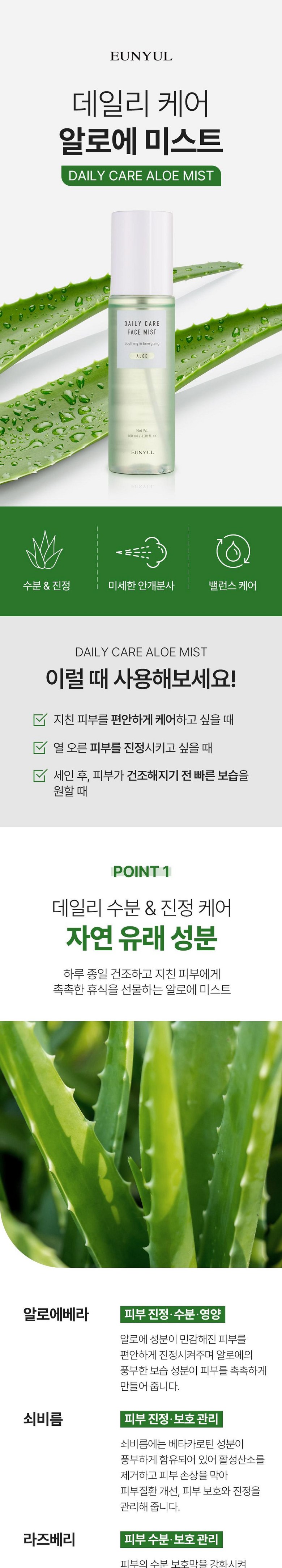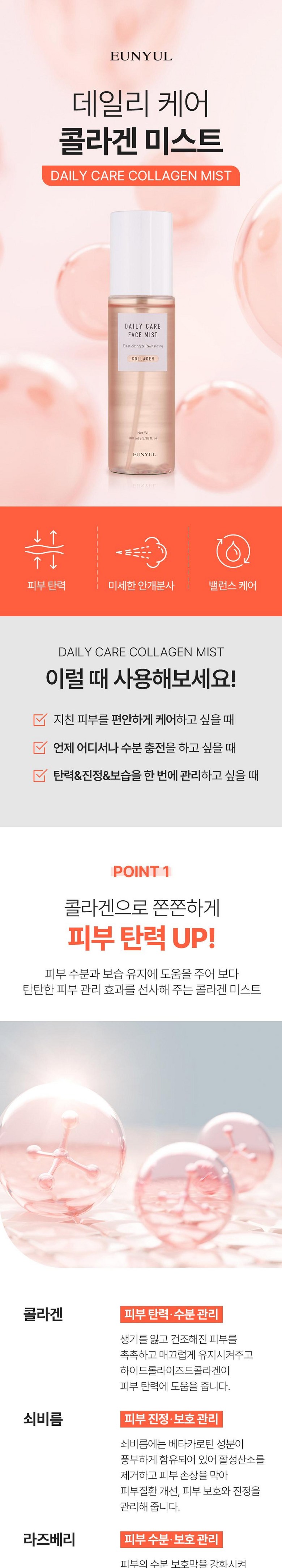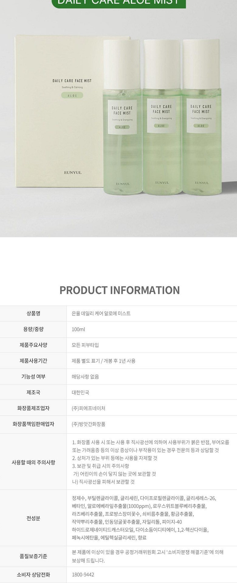 Набор из 3 спреев для лица Eunyul Daily Care Mist, Eunyul Collagen, Aloe, Hyaluronic Acid, 100 мл, 1 комплект.