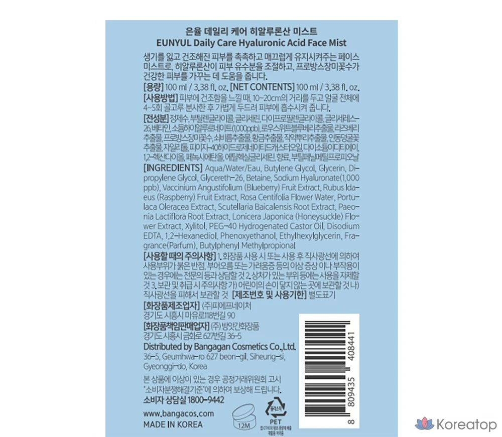 Спрей для ежедневного ухода за кожей Eunyul с гиалуроновой кислотой, 100 мл, 1 шт.