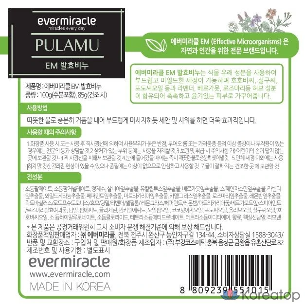 Ферментированное мыло Evermiracle Fullamu EM создано для бережного ухода за кожей. Благодаря натуральному составу и ферментированным компонентам, оно эффективно очищает и увлажняет, оставляя кожу мягкой и свежей. Уникальная формула способствует восстановлению естественного баланса кожи, делая её более упругой и здоровой. Экологичная упаковка и натуральные ингредиенты делают это мыло отличным выбором для тех, кто заботится о природе и своём здоровье. 🧼🌿