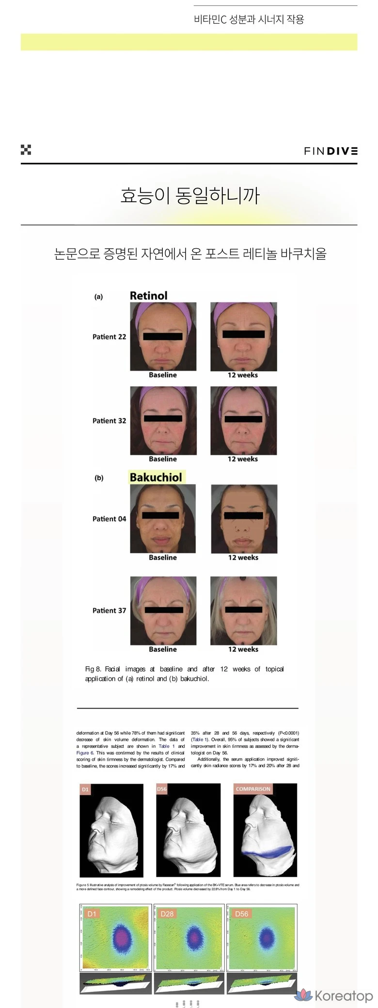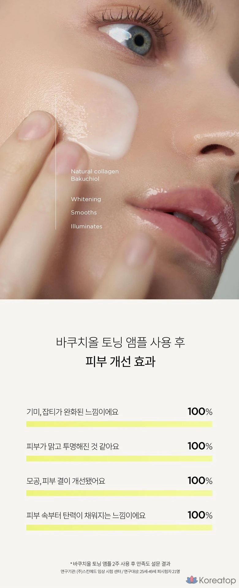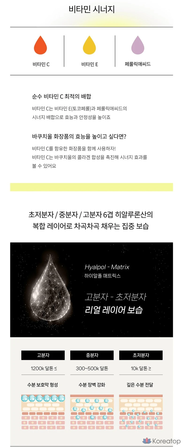 Бакучиол (3%), сок каму-каму (74%), пантенол, альфа-бисаболол, комплекс из 6 видов гиалуроновой кислоты, витамины C и E, феруловая кислота.