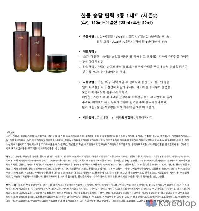 Набор HANYUL Songdam Elasticity из 3 предметов (средство для лица 150 мл + эмульсия 125 мл + крем 50 мл), 2 сезон, 1 набор.