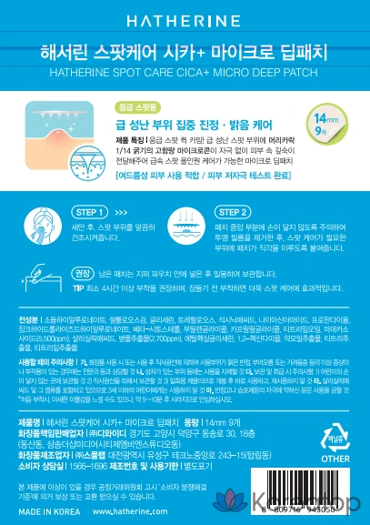 Точечные патчи HATHERINE Spot Care Cica+ Micro Deep Patch предназначены для эффективного ухода за проблемной кожей. Благодаря микроиглам, пропитанным экстрактом центеллы азиатской, они глубоко проникают в кожу, успокаивая воспаления и ускоряя процесс заживления. Патчи создают защитный барьер, предотвращая попадание бактерий и загрязнений, что способствует быстрому восстановлению кожи. Рекомендуется наносить на очищенную сухую кожу и оставлять на 8–12 часов для достижения оптимального результата. 🌟
