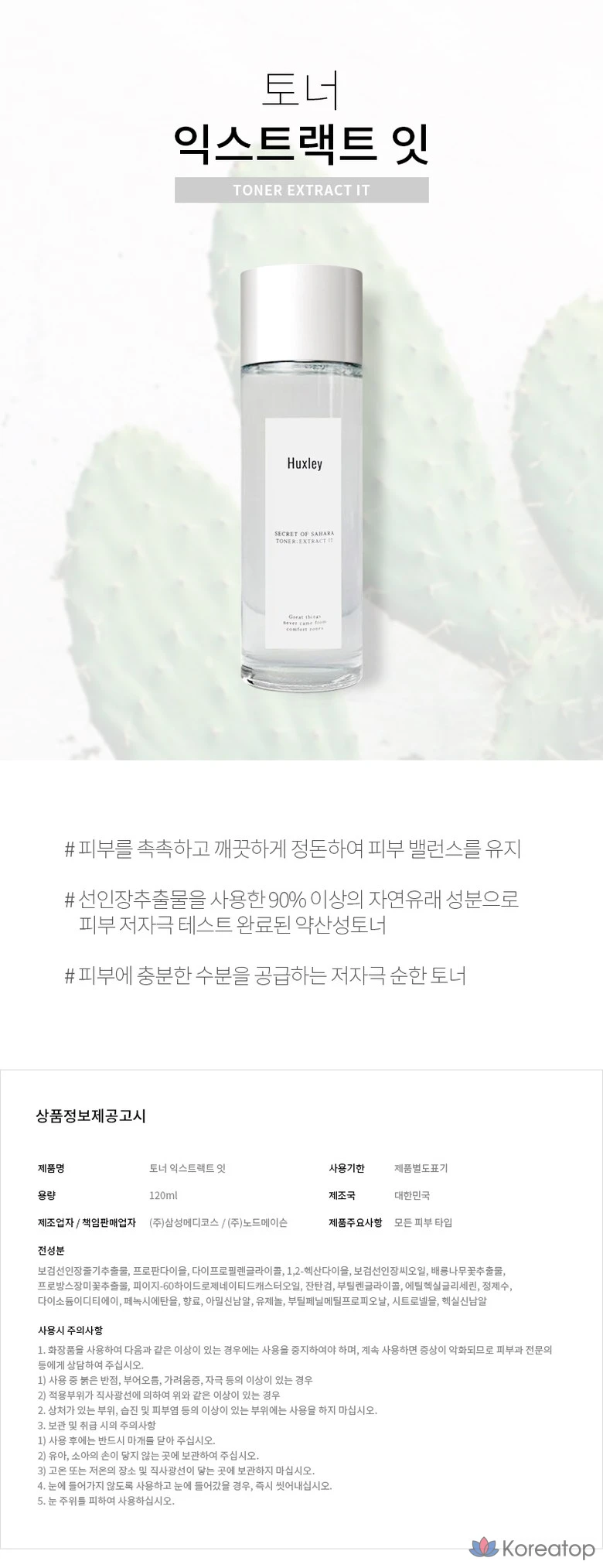 [Huxley Genuine] Тоник Extract It 120 мл + Увлажняющий лосьон для кожи Enclase Snail 2 мл, 120 г, 1 шт.