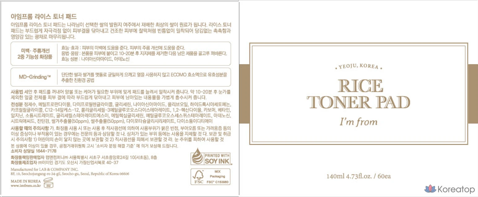Тоник-подушечки I'm From Rice, 140 мл, 1 шт., 60 листов.