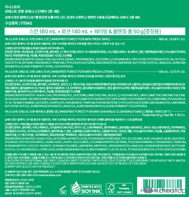 Набор Innisfree Forest for Men Fresh Skincare: 180 мл (кожа) + 140 мл (лосьон) + 50 г (средство для бритья и очищения), 1 комплект.