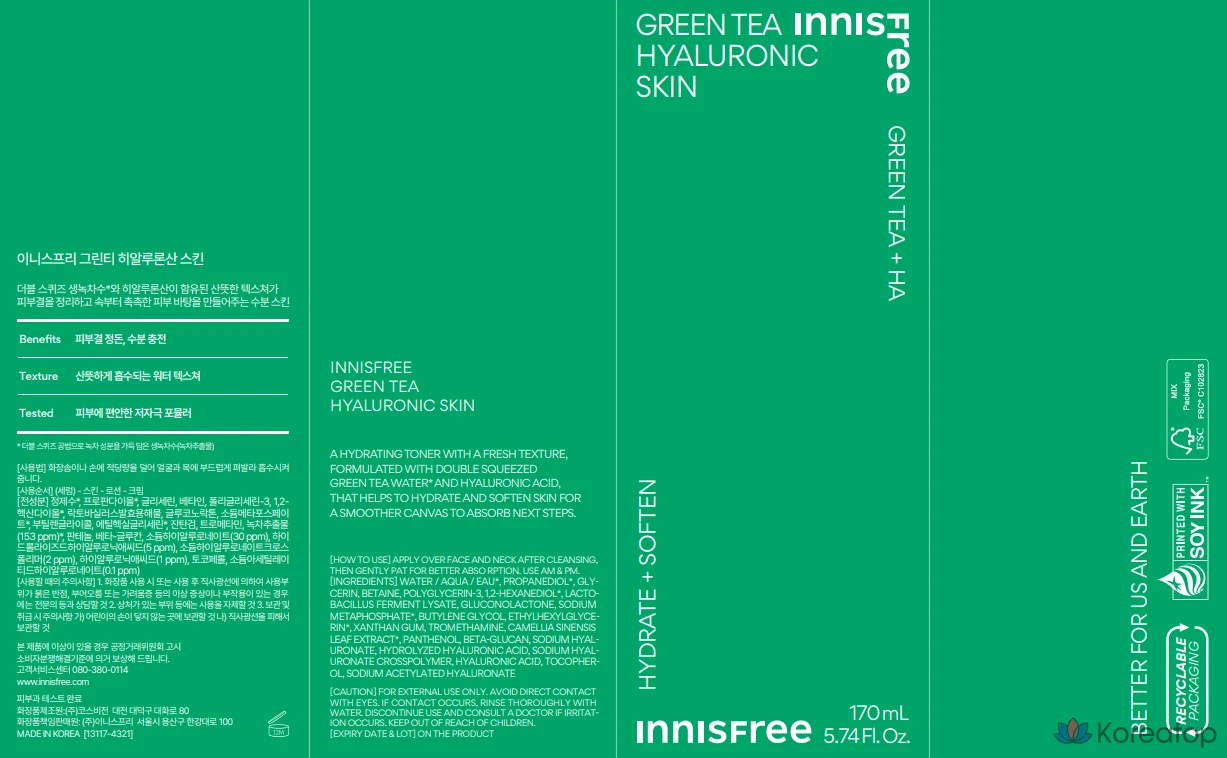 Innisfree Green Tea Hyaluronic Acid Skin, 170 мл, 1 шт.