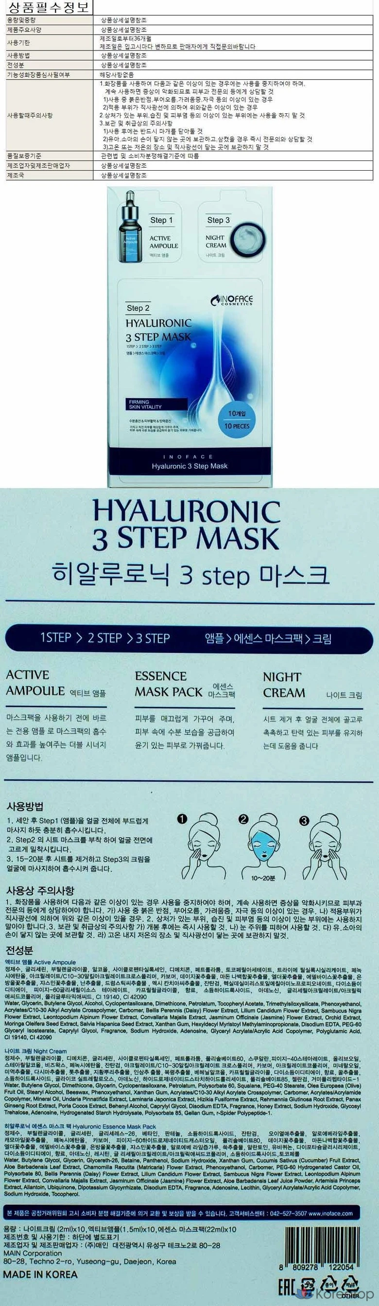 Набор из 3 масок Inoface с гиалуроновой кислотой, 10 штук