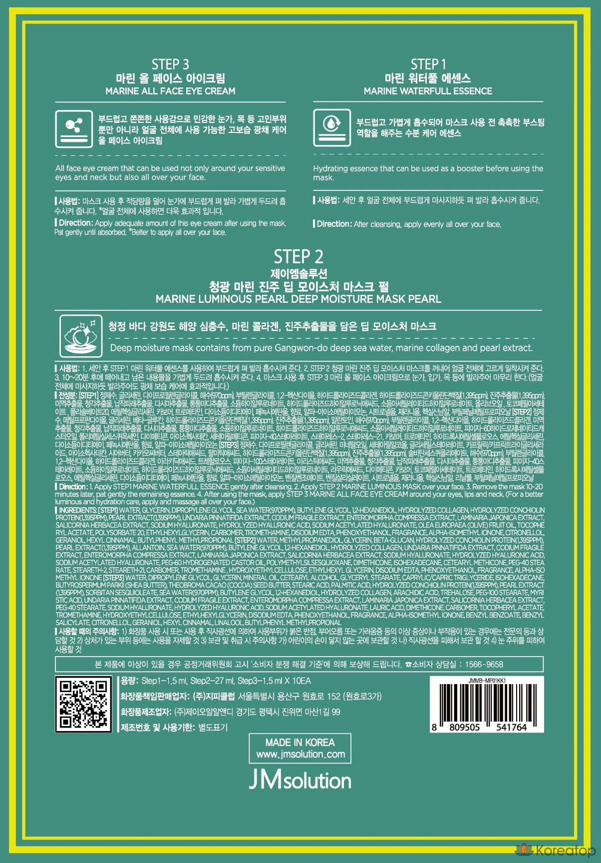 Трёхшаговая увлажняющая маска JMsolution Marine Luminous Pearl Deep Moisture Mask обеспечивает комплексный уход за кожей лица. Первый этап — эссенция, подготавливающая кожу и усиливающая действие последующих средств. Второй этап — тканевая маска, насыщенная экстрактом жемчуга и морскими водорослями, глубоко увлажняет и придаёт коже сияние. Третий этап — крем для глаз, который можно наносить на всё лицо для дополнительного питания и защиты. Маска подходит для всех типов кожи, включая чувствительную, и помогает восстановить её упругость и эластичность. 🌟