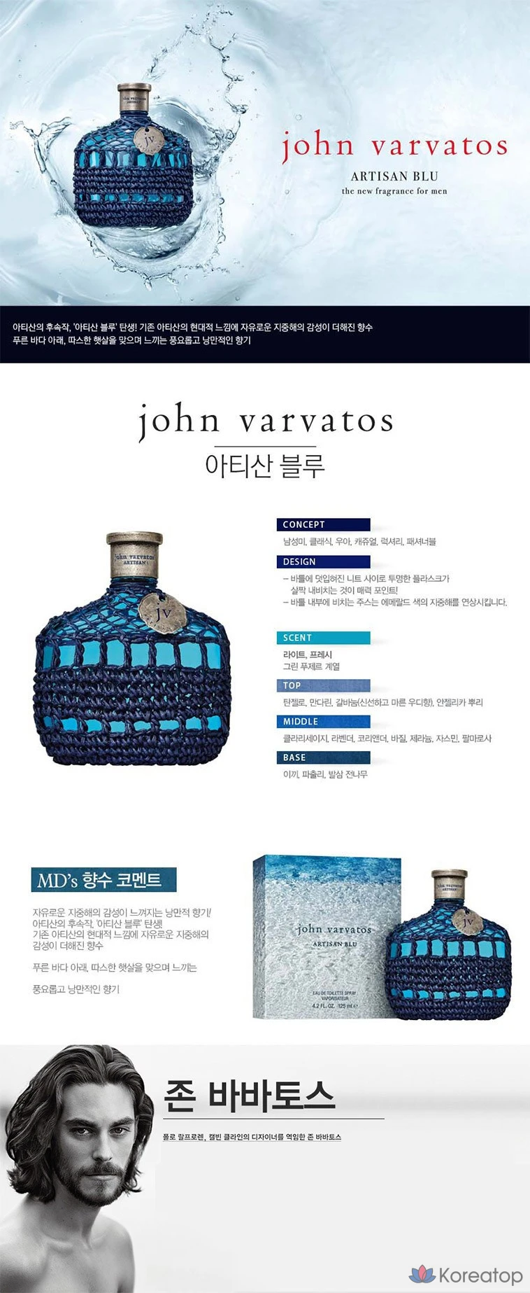 Artisan Blu от John Varvatos — это мужская туалетная вода, выпущенная в 2016 году. Аромат открывается свежими нотами бергамота, лаванды, базилика, горького апельсина и чайота. В сердце композиции — герань, пальмароза, ирис, апельсиновый цвет и мускатный шалфей. Базовые ноты включают пачули, белый кедр, сосну, фисташки и тамариск. Флакон оформлен в стиле плетёного узора, отражая морскую тематику аромата. ([fragrantica.ru](https://www.fragrantica.ru/perfume/John-Varvatos/Artisan-Blu-35456.html?utm_source=openai))