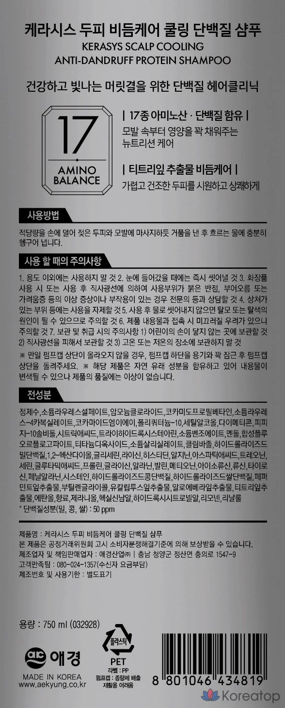 Охлаждающий протеиновый шампунь KeraSys для ухода за кожей головы и борьбы с перхотью, 750 мл, 1 шт.